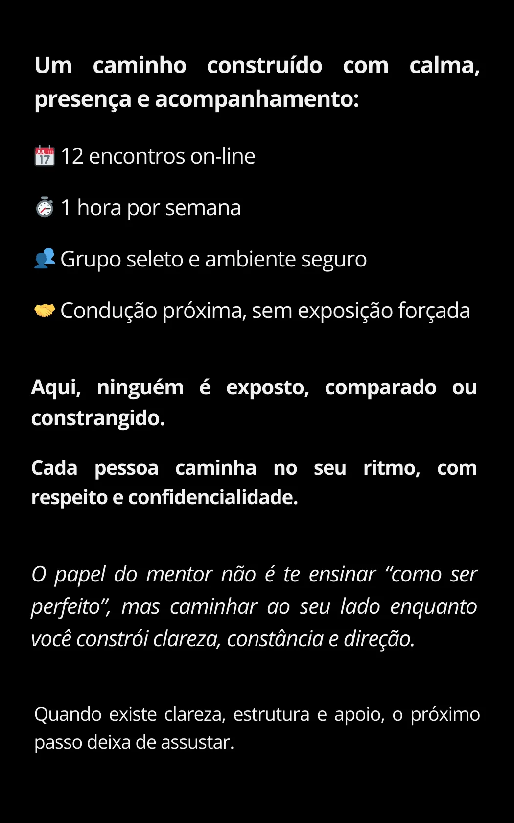 Compartilhamentos são sempre opcionais. O ambiente é construído com respeito, confidencialidade e cuidado.
