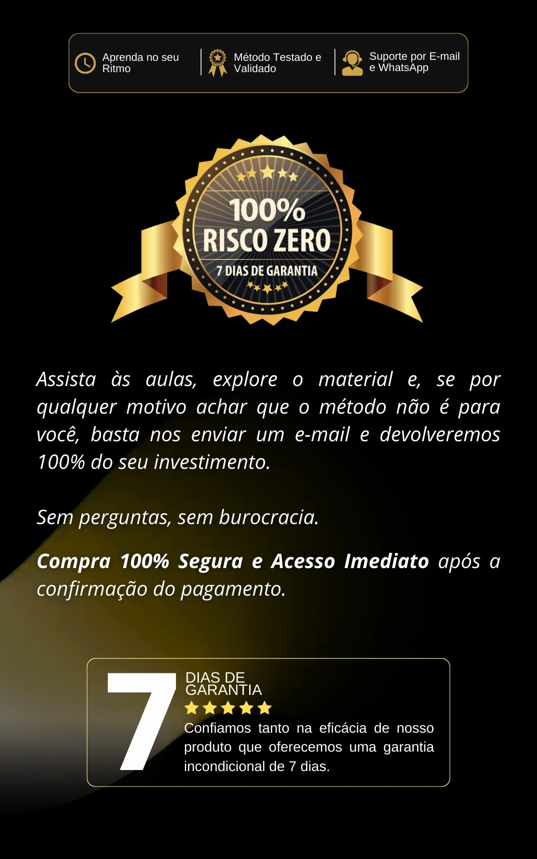 Você tem 7 Dias de Garantia Incondicional. Se não se adaptar, devolvemos 100% do seu dinheiro. Sem perguntas, sem burocracia. Basta enviar um e-mail para suporte@mentordavidjunior.com.br