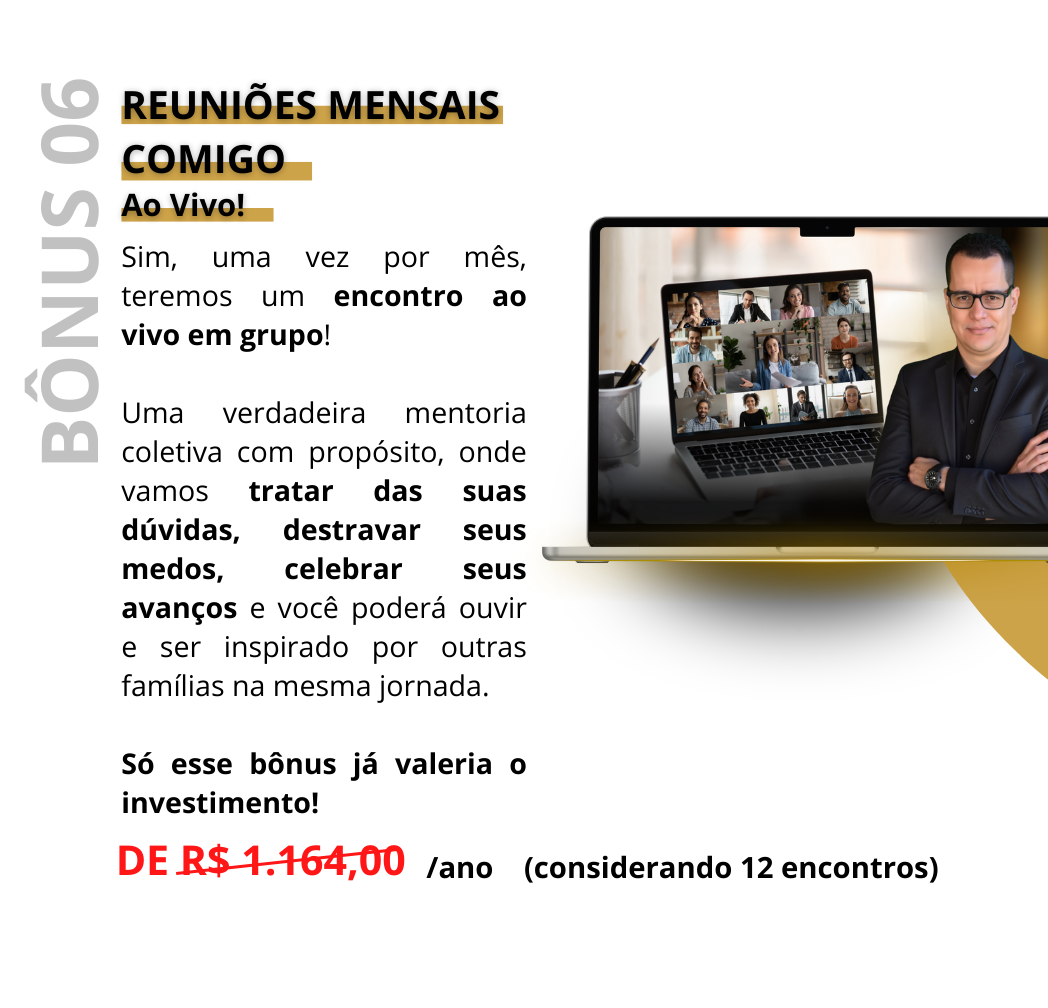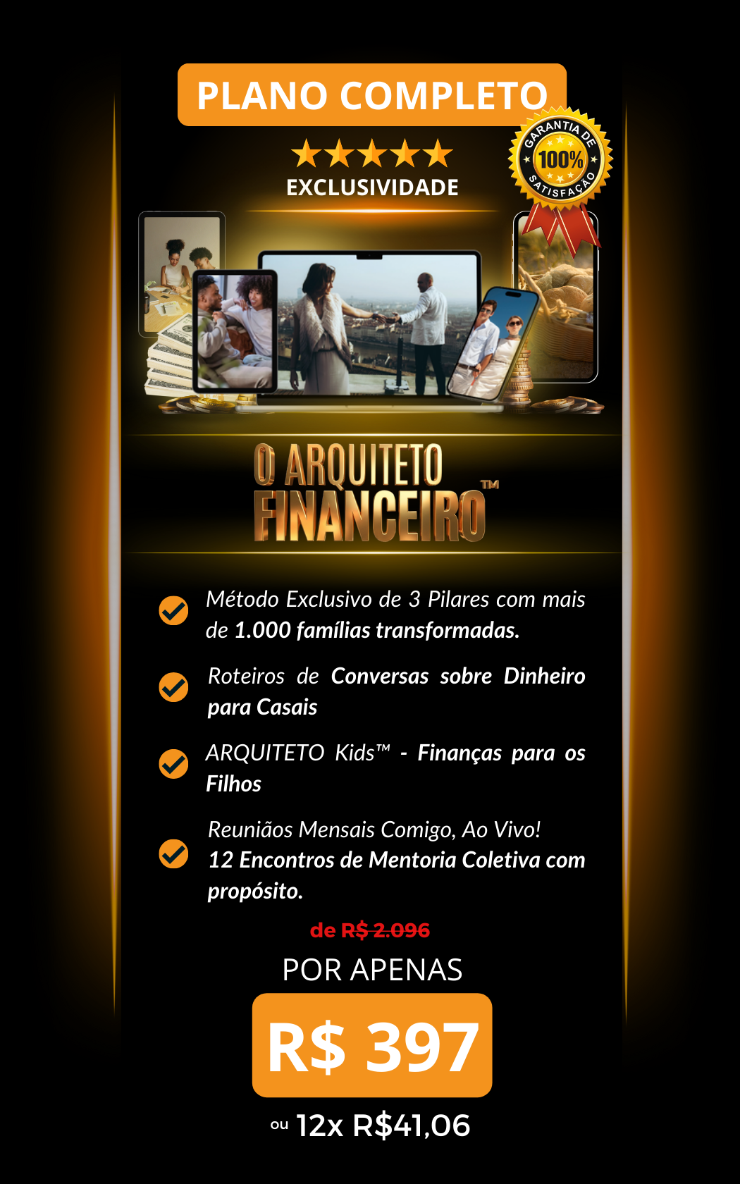 O Método O ARQUITETO FINANCEIRO™ é 100% online com aulas gravadas para você assistir no seu ritmo, quando e onde quiser. Além disso, temos encontros mensais AO VIVO em grupo (bônus) para acompanhamento.